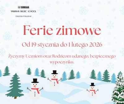 2026-01-18Ferie zimowe w szkole muzycznej W dniach 19 stycznia – 1 lutego 2026 r. robimy przerwę na ferie zimowe. Życzymy Uczniom i Rodzicom udanego wypoczynku i do zobaczenia po feriach!